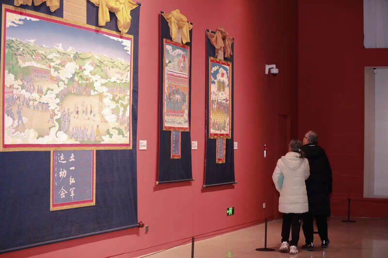 起源于17世纪的郎卡杰唐卡,作为国家级非遗代表性项目,以其独特的矿物颜料和精微透视技法独树一帜。展览借助郎卡杰画派匠人的精湛笔触,艺术地重现了藏族同胞支援红军、汉藏军民团结互助的历史场景。