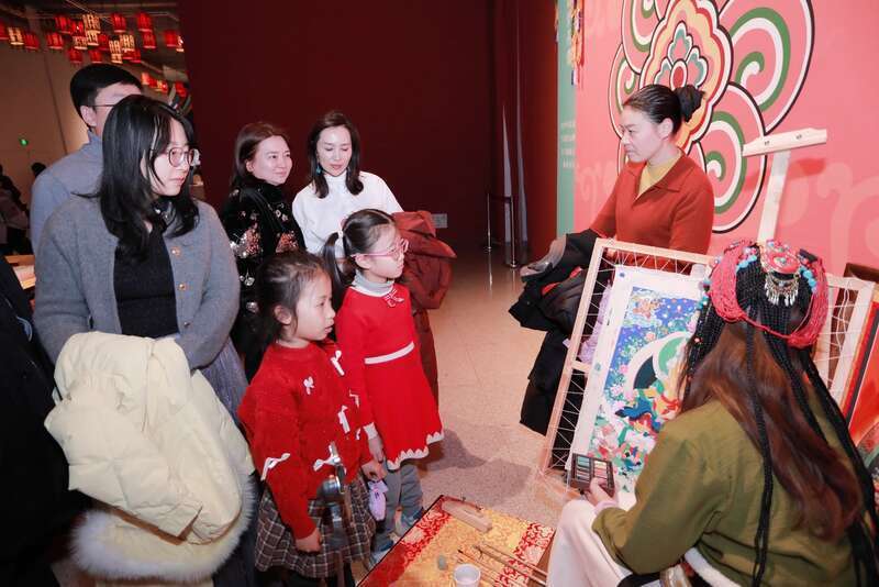 展览开篇以“雪域丹青 千年流韵”为主题,系统梳理了郎卡杰画派的发展历史。画派创始人郎卡杰,被人们尊称为“天空的装饰者”,他的绘画技艺代代传承,从侧面展现了中华文明多元一体的鲜明特征,彰显了中华民族文化的包容性与统一性。