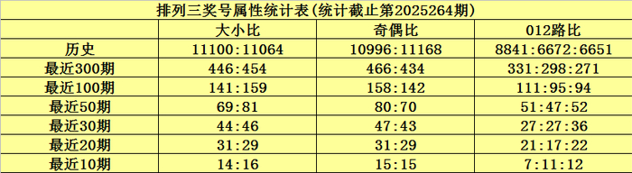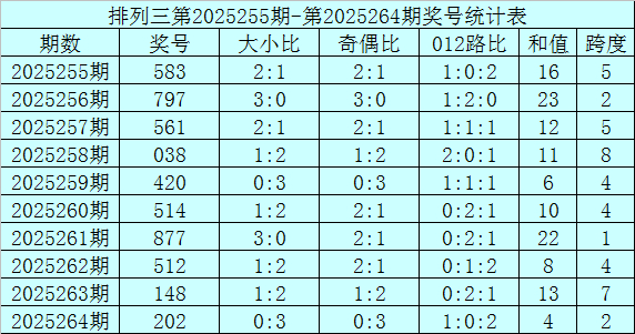 上期回顾:排列三第2025264期奖号为202,奖号012路比为1:0:2,奇偶比为0:3,大小比为0:3,和值为4,跨度为2。