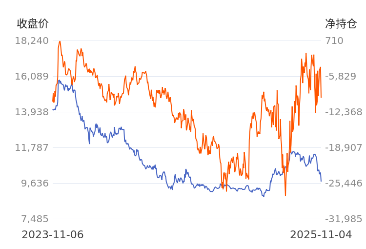 11月4日,红枣前20名期货公司(全月份合约加总)多单持仓15.17万手,空单持仓16.15万手,多空比0.94。净持仓为-9805手,相较上日减少5679手。