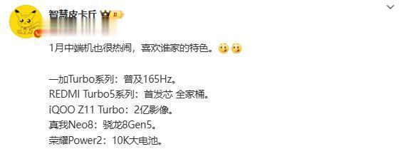 【CNMO科技消息】12月26日,数码博主@智慧皮卡丘 称有多款新机将于2026年1月发布,包含REDMI Turbo5系列、一加Turbo、iQOO Z11 Turbo、真我Neo8和荣耀Power2五款机型。该博主还称,REDMI Turbo5系列将首发全新芯片。