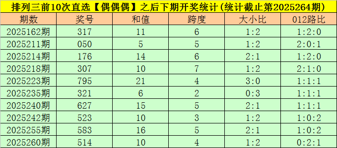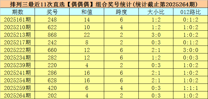开奖回顾:排列三第2025264期开出奖号:202,类型为组三,和值为4,奇偶比为0:3,大小比为0:3,跨度为2。