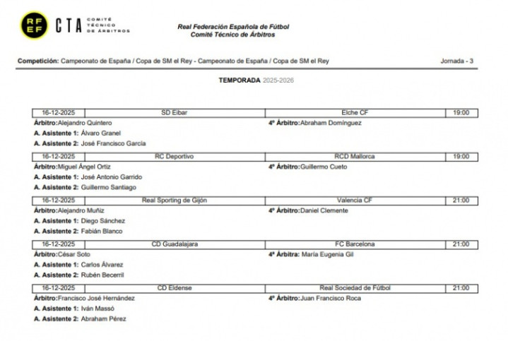 直播吧12月15日讯本周中,西班牙国王杯1/16决赛将拉开战幕,西班牙足协官方公布了相关比赛的裁判安排,其中,索托执法巴萨客战瓜达拉哈拉。