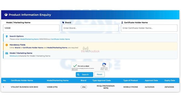 【CNMO科技消息】12月25日,据外媒报道,vivo V70已获得SIRIM认证,认证编号为 V2549。该认证的有效期至2026年5月,意味着V70将在马来西亚及周边地区正式上市。此外,还有即将发布的vivo X300 FE和JOVI X300 FE也通过了SIG认证。